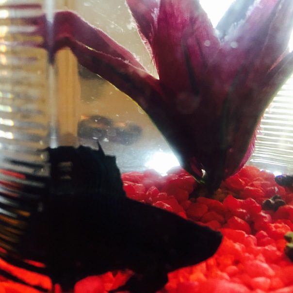 a fish shadowed in a water tank with red pebbles and a large flower.