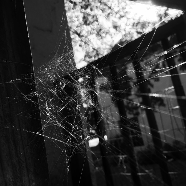 A spider web in front of a window overlooking another building.