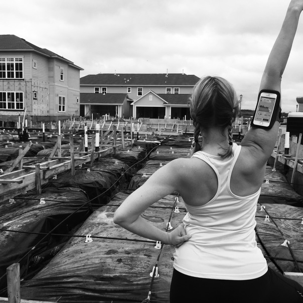 A woman wearing a white tank top and dark pants and an armband with a cell phone raises her hand in the air in front of a residential construction site.