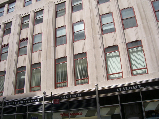 The outside of a large building showing part of the ground floor, but mostly the rows of windows above.