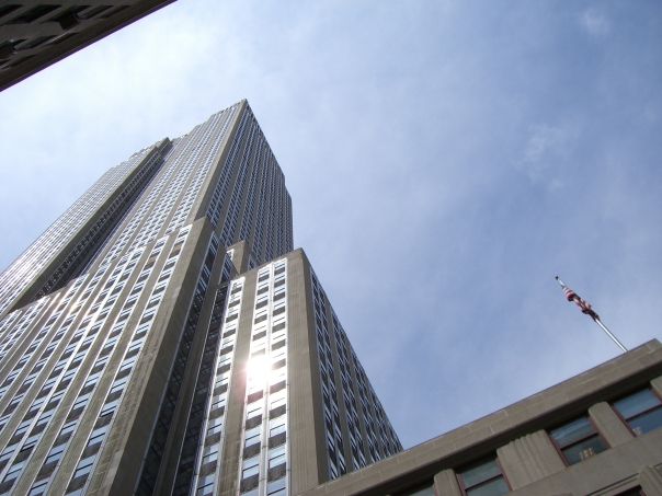 A photo looking up at a very tall, grey building with a lot of windows.