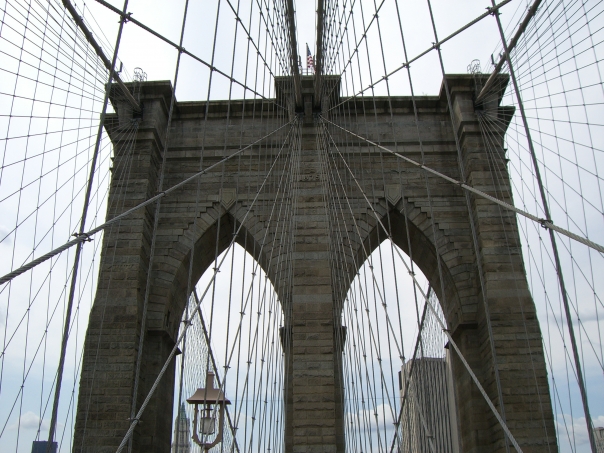 The cables of the huge Brooklyn Bridge crisscross hundreds of feet high.