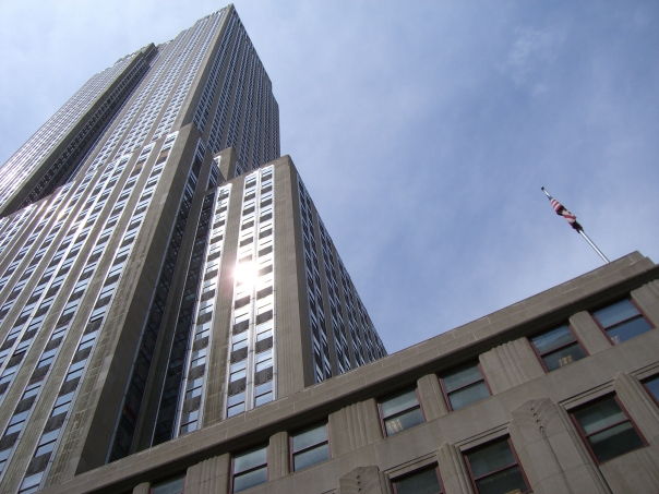 This is a view of a skyscraper from standing on the ground looking up towards the sky. This cement structure has hundreds of windows, no adornments, however, there is a flagpole and flag on the lower story.