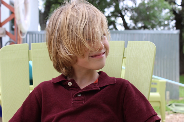 A young boy with blonde hair making a goofy smile while looking to the left.