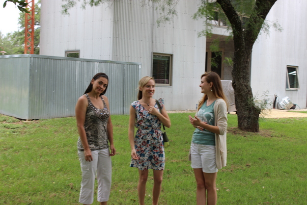 Three young woman in casual clothing are standing outside a plain white building talking to one another.