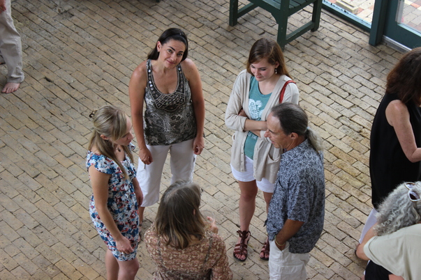 A group of people standing around talking and one woman smiling up at the camera.