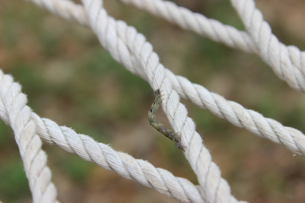 The green worm is very easy to see in contrast to the white fibers of the netting material.