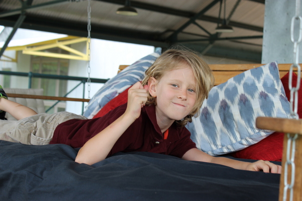 the child in this pic appaears to be jumping on a bed an his parents or friend snagging a pic before he knew it then found out saying dangint guys i said no he is also wearing tan shorts an red polo shirt with blonde bushy hair an making a a tight lip angressive look with a comical fist.