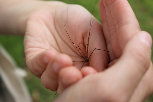 A granddaddy long leg spider in the hands of a Caucasian person.