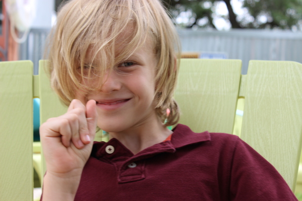 The unkempt child relaxed in the wooden beach chair while is mother ordered their lunch at the fish shack.