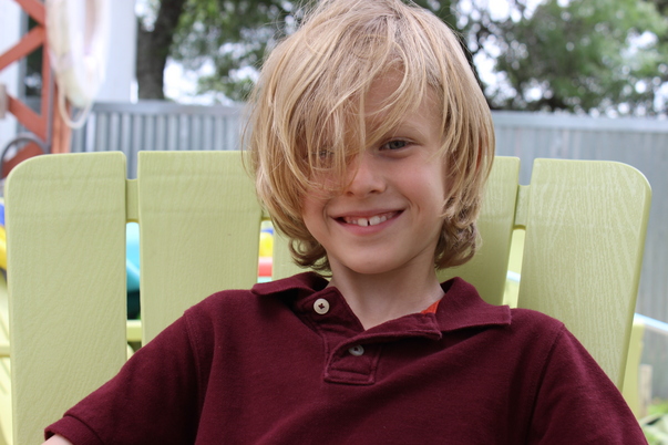 A young boy with shaggy blonde hair is sitting outdoors and smiling.