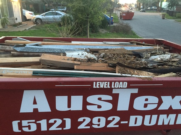 A very large dumpster from Austex full of old materials from a construction projection.