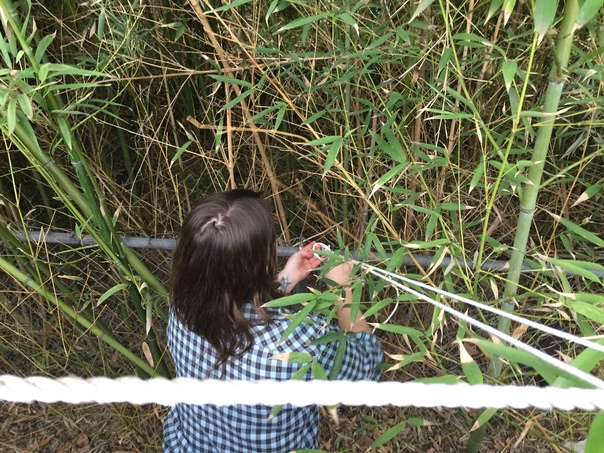 A woman adjusting a rope in a field of green plants.