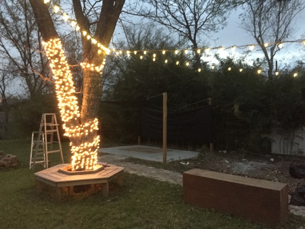 Christmas lights wrap around a tree trunk and spread across the yard.