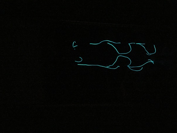 There are some bright blue squiggly lines in the pitch black darkness.
