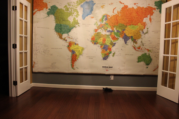 a big map is on the wall of all the diffrent countries around the world.