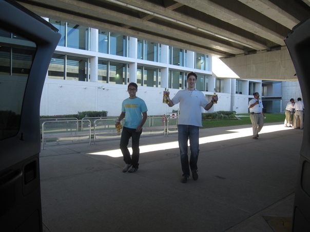Two young men casually walking outside a building, smiling broadly while carrying bottles of beer. |