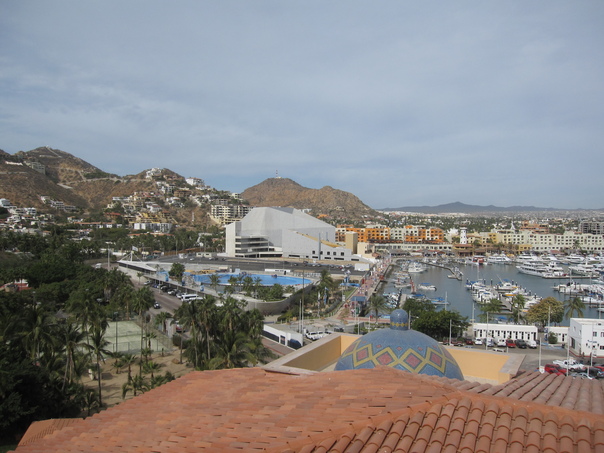Modern architecture adorns a tropical skyline surrounding a crowded marina. |