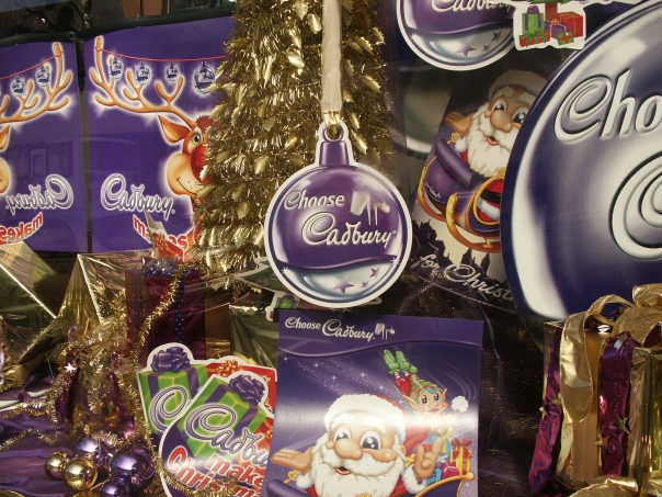 There are many Cadbury labeled items including one with Santa Claus on one.
