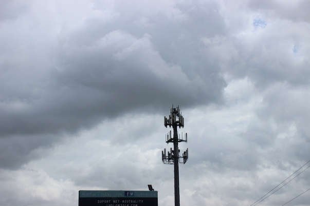 A radio tower stands tall near a billboard and some electric wires.