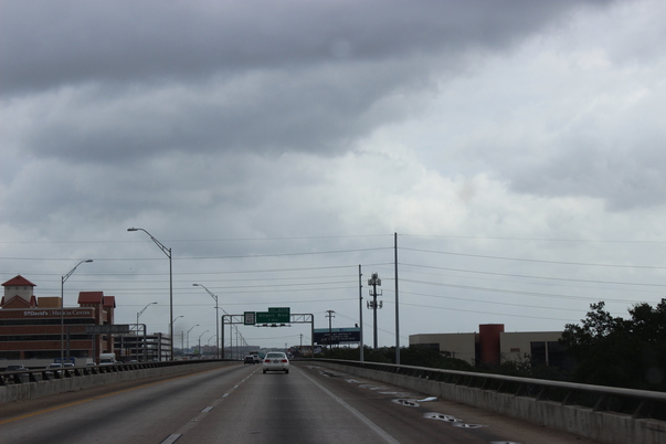 Cars driving on a highway during mid day, under a darkened cloudy sky.