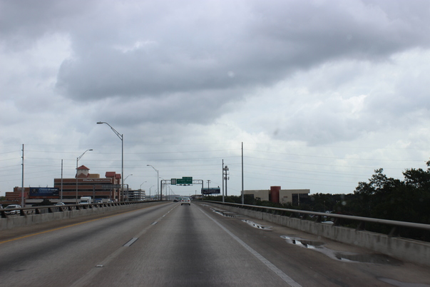 A major highway over pass with little traffic going in one direction; the other side of the road has many more cars.