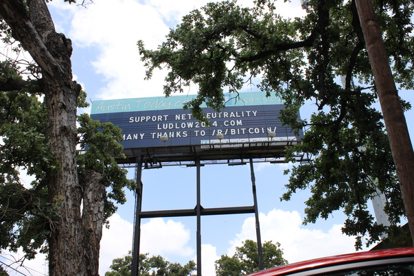 A big blue billboard held up high in the air supporting Net Neutrality.