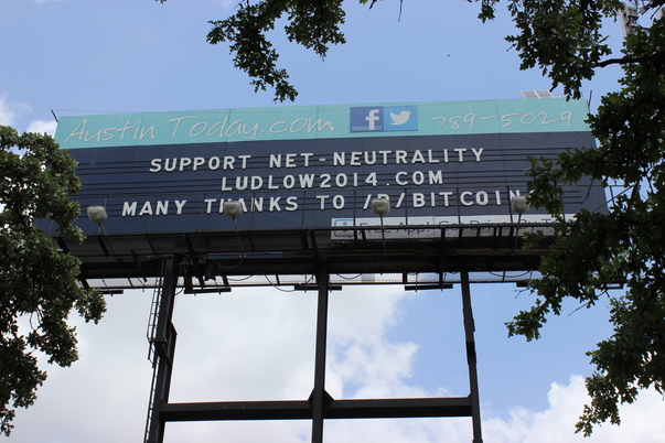 This photograph shows a billboard that was put up in favor of net neutrality.