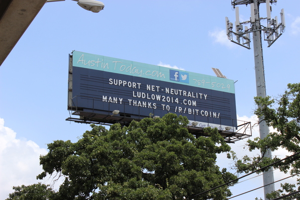 a advertisement board is displaying on the top of the tree that contains support net neutrality