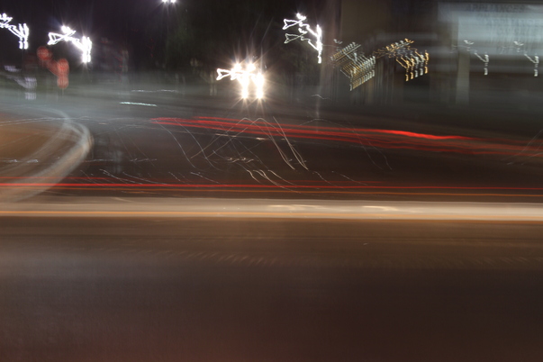 A blurry picture with various red streaks that is from traffic at nighttime.