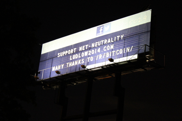 A night scene displaying an outdoor billboard asking people to support Net-Neutrality.