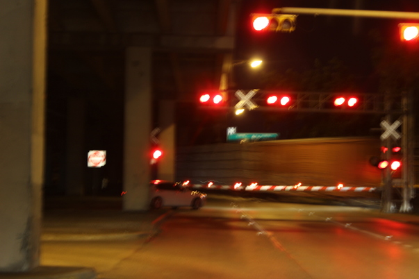 THE MANY BRIGHT LIGHTS ON THE RAILROAD CROSSING ARE A GREAT VISUAL WARNING FOR THE WHITE CAR TO STOP.