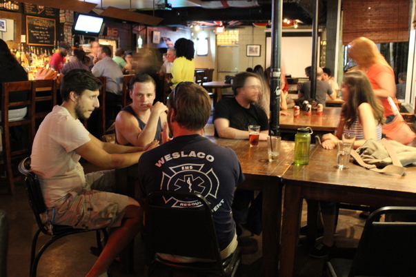 Men sitting casually around a wooden table in some sort of bar or restaurant.