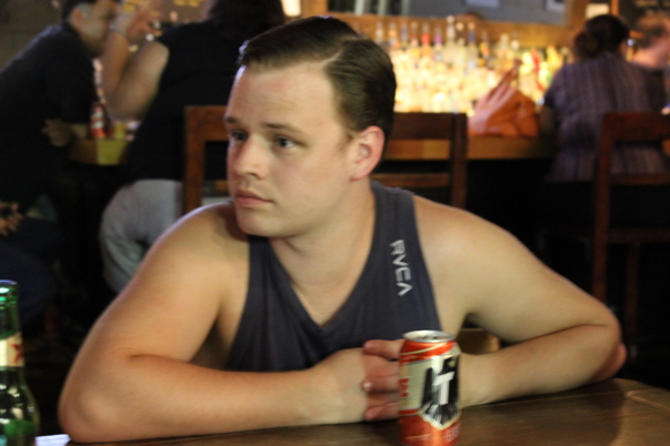 A man with combed, gelled hair is sitting at a table at a pub wearing a black tank top.