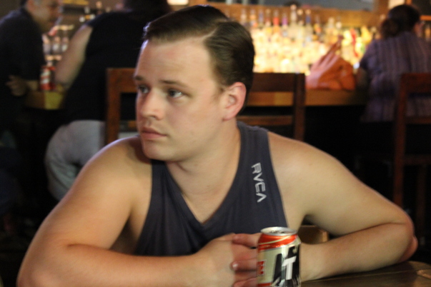 Young Caucasian male sitting at a bar, in a muscle shirt, with a beer in front of him.