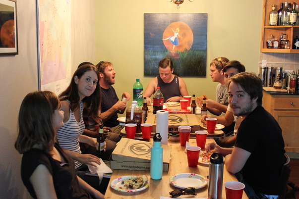 A group of friends at a gathering and enjoying each other's company along with pizza and adult beverages and soda pop.