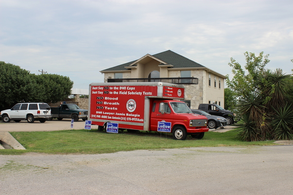 Here parks a red box truck advertising for a DUI lawyer who apparently is against DUI test given by law enforcement. |