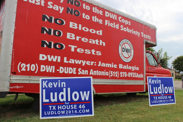 A bright red truck advertising a DWI Lawyer in San Antonio is parked behind two Kevin Ludlow for TX House 46 lawn signs. |
