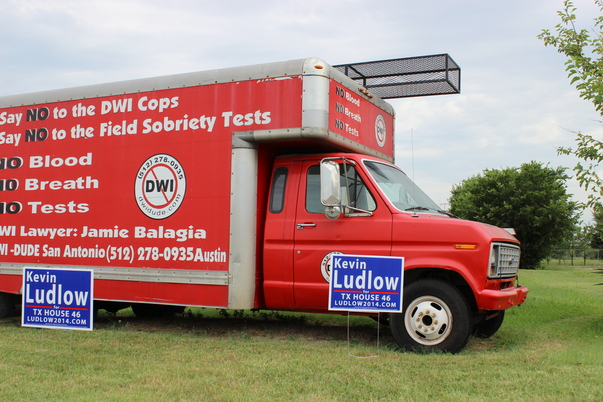 A red van being used for advertisement is parked in a filed behind political candidate signs. |