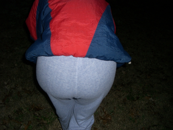 A person wearing gray sweat pants and a red and blue jacket shows off their ample butt to the camera.