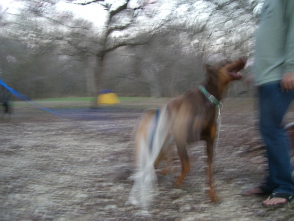 blurry photo of medium size athletic brown dog playing with a man