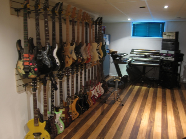 The music instrument shop has a variety of many kitars in many colors