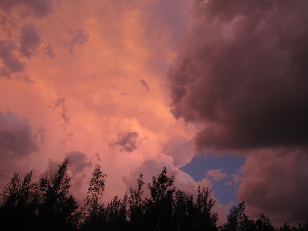 An eye-catching scenary of black, white and orangish clouds and a little blue sky peeping out
