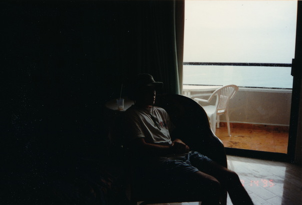 In a dark bar, just beyond the patio of the lake house beach, a man wearing a tee shirt, shorts and cowboy hat relaxes after drinking a nice cocktail in a plastic glass.