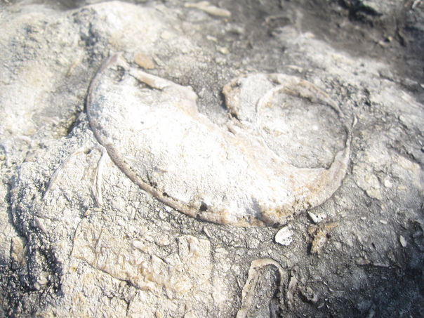 There is a fossilized piece of material embedded inside a grey and white ground.