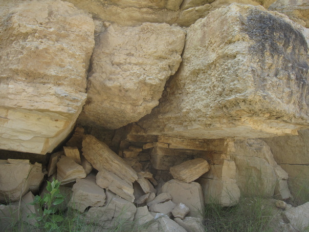 There are huge rocks that are stacked up against each other look almost like a boulders