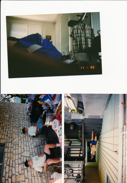 A trio of photos including two men sitting against a brick wall, a woman coming down a corridor, and a plaid shirt hanging in a closet. |