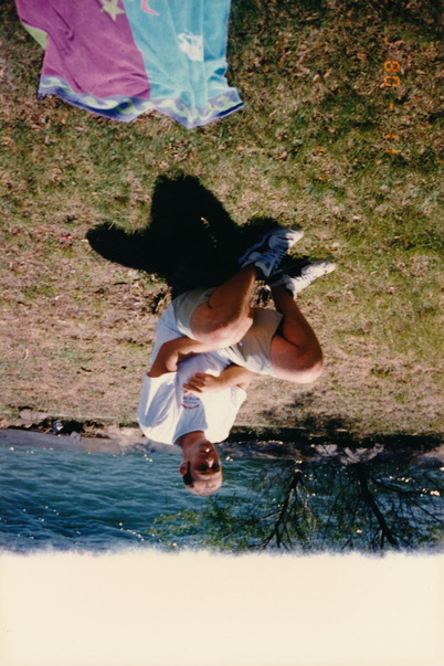 Man sitting on the sandy shore of a lake next to a blanket with stars on it. |
