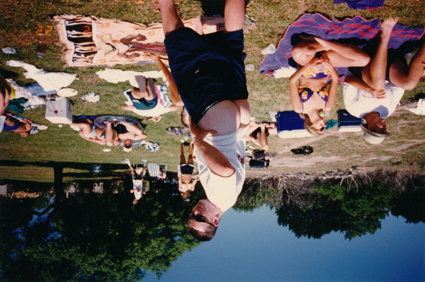 A young man standing in front of sunbathers reveals his butt to the camera. |