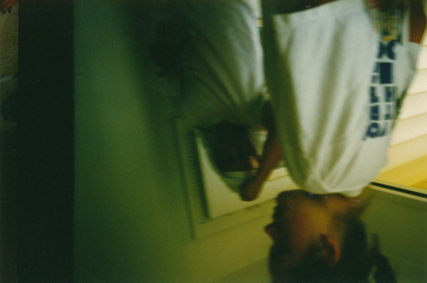A young girl in a white tee shirt touching the head of a person on her left. |